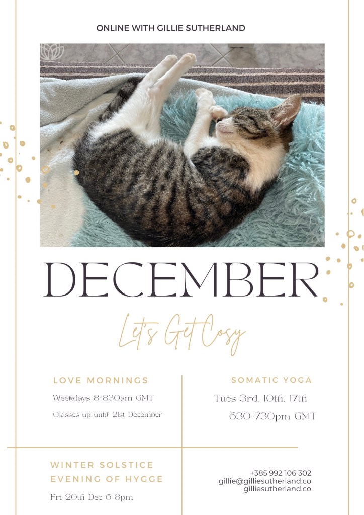 - Cosy Somatic Yoga – gentle, restorative and healing yoga to boost your oxytocin levels and help you enter a state of deep rest. Tuesdays 3rd, 10th, 17th Dec 630-730pm GMT